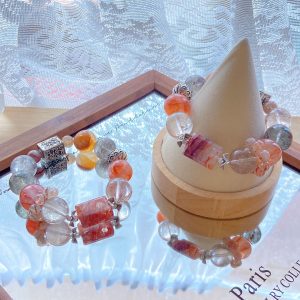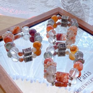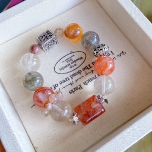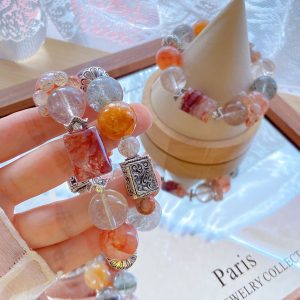This bracelet combines three natural treasures: a red gum flower peace and safety charm, green phantom, and black gold ultra crystal. Its design blends traditional auspicious meanings with the modern aesthetics of crystal energy, making it a high-end crystal accessory that possesses the triple attributes of blessing, wealth, and protection.