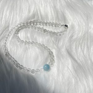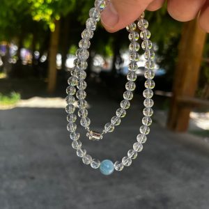 This exquisite clavicle necklace is made from pure natural white crystal, paired with a clear aquamarine, simple yet elegant. White crystal symbolizes purity and beauty, while aquamarine represents courage and hope. The necklace is cleverly designed to flatter the neckline, making it an ideal choice for everyday wear. Whether for casual or formal occasions, it adds a touch of brightness.